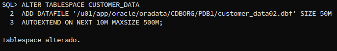 ADD DATAFILE '/u01/app/oracle/oradata/CDBORG/PDB1/customer_data02.dbf' SIZE 50M