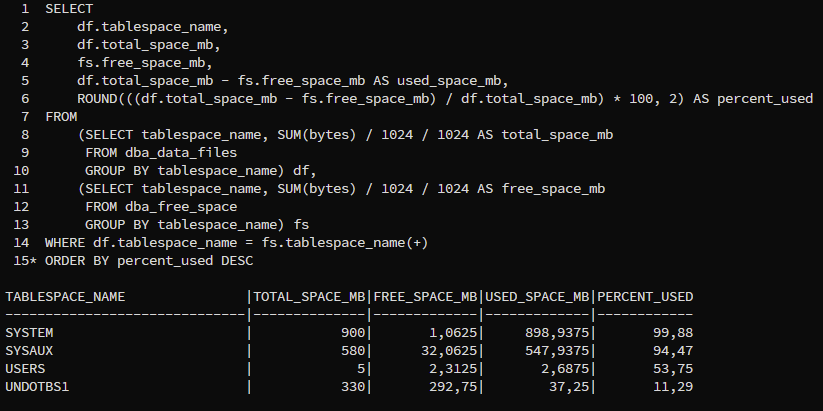 Esta query te dará uma visão clara do espaço total, espaço livre, espaço usado e a porcentagem de uso de cada tablespace.