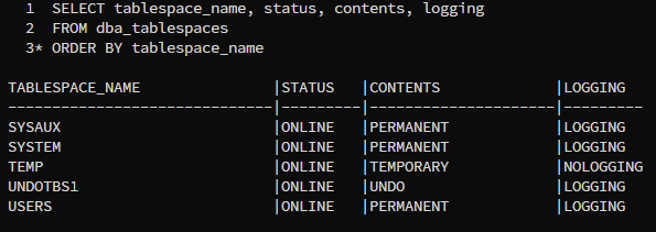 Você notará tablespaces como SYSTEM, SYSAUX, UNDOTBS e TEMP. Estas são tablespaces essenciais criadas por padrão pelo Oracle.